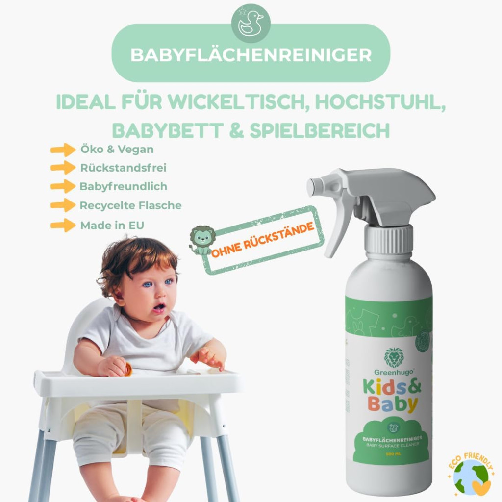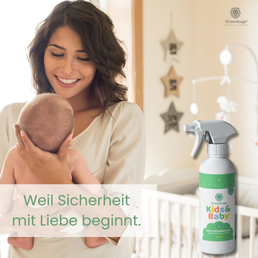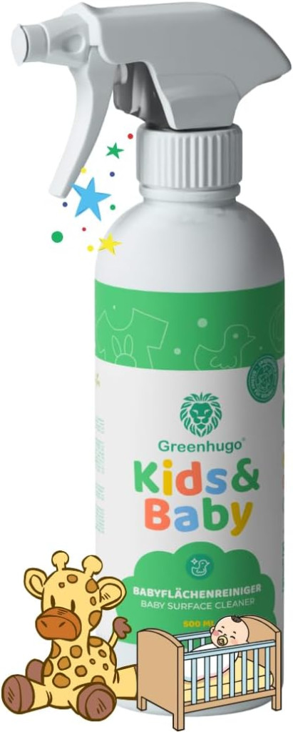 The Greenhugo Baby Surface Cleaner was specifically developed for daily cleaning of baby surfaces. It reliably removes dirt without harsh chemicals and leaves no residue. Ideal for changing tables, high chairs, cribs, and play areas – for a safe and clean home.